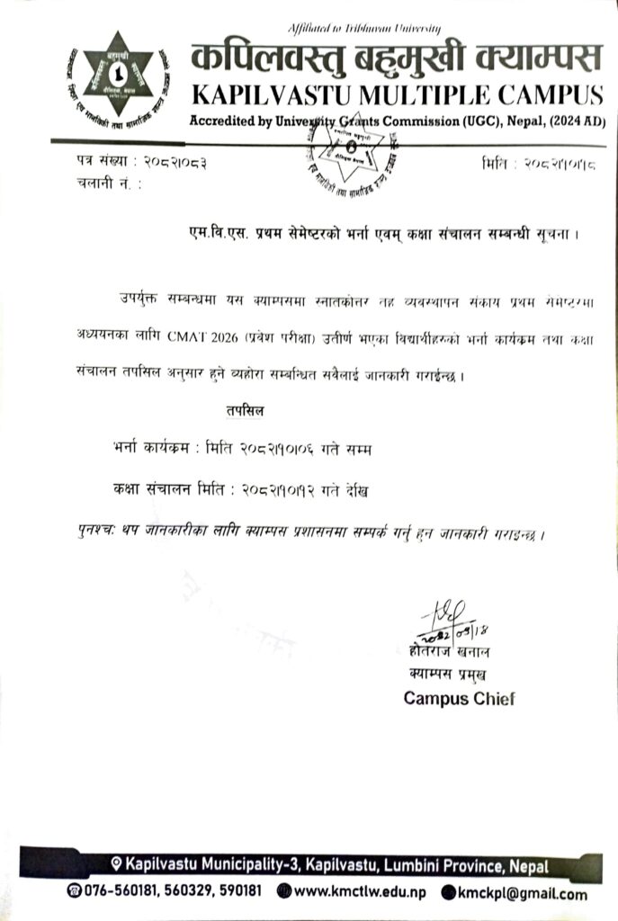 एम.वि.एस. प्रथम सेमेष्टरको भर्ना एवम् कक्षा संचालन सम्बन्धी सूचना ।